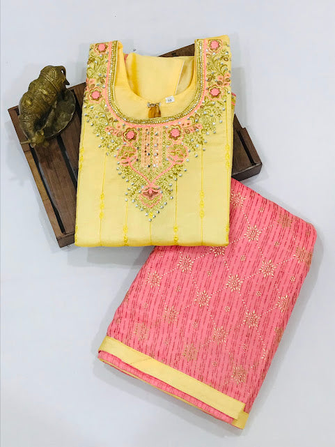 Charming Yellow Colored Embroidery And Printed Work With Silk Langa Sets For Girls