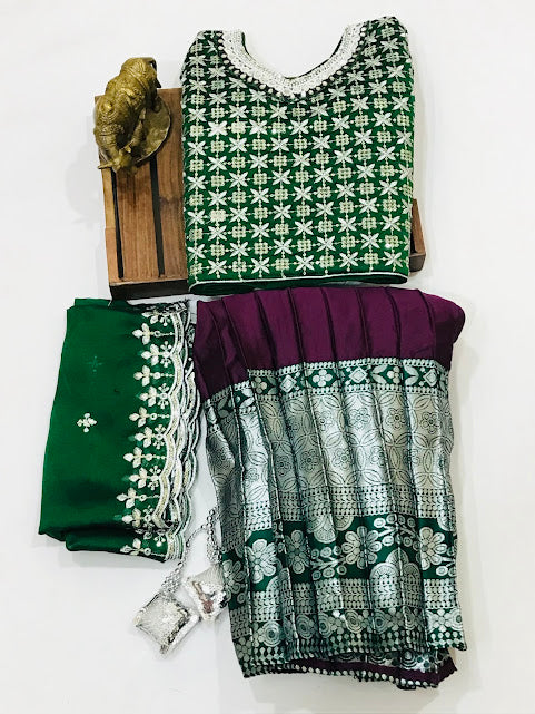 Gorgeous Embroidery And Stone Work Green Color Silk Langa Sets For Girls