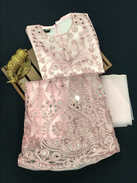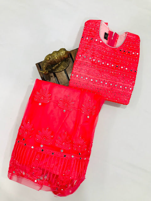 Charming Pink Colored Full Net Embroidery Mirror Work Choli Sets For Girls