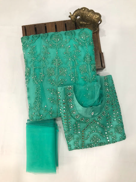 Gorgeous Aqua Green Designer Mirror And Embroidery Work Choli Sets With Shrug For Girls