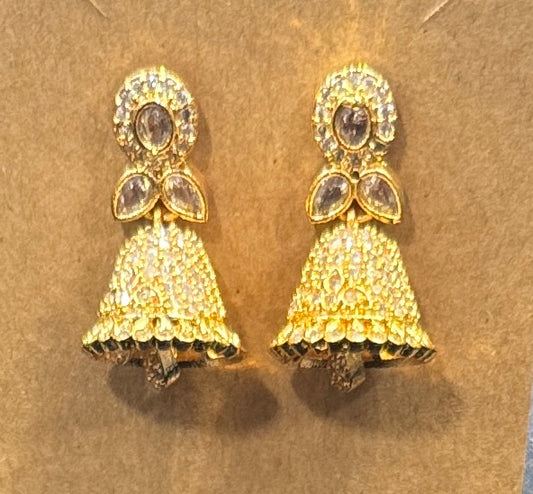 Alluring Doll Shaped Gold Plated Jhumka Earrings With White Stones For Women