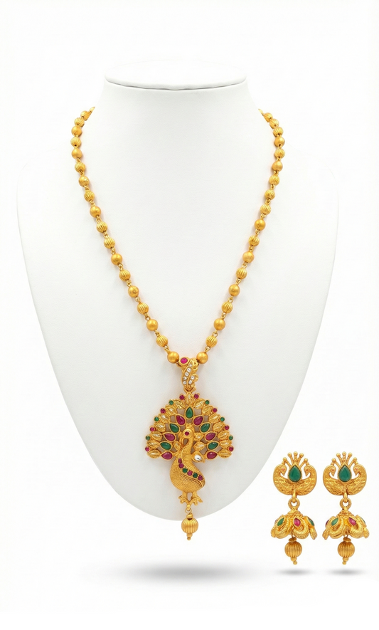Gorgeous Gold Plated With Matt Finish Peacock Shaped Dark Pink & Green Stones Necklace And Earrings Set