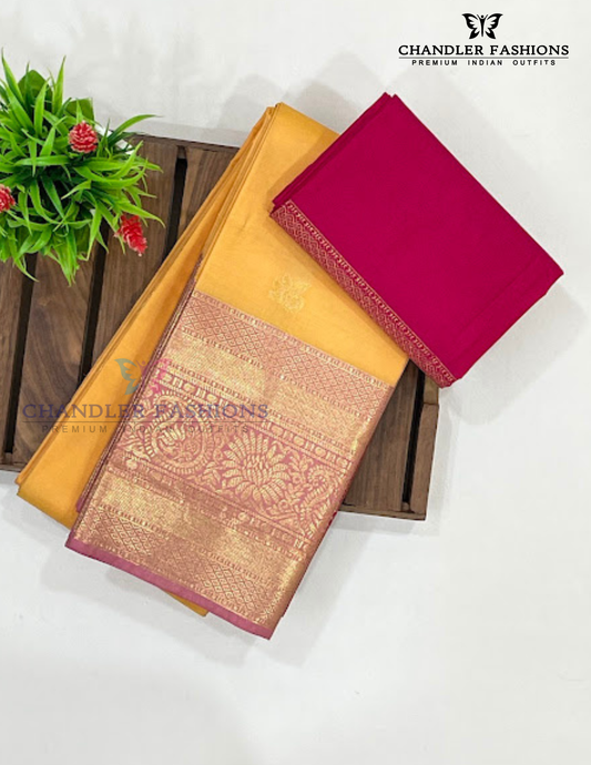 Wonderful Yellow Color Pure Kanchi Silk With Pink Pallu And Gold Zari With Tradition Motifs Border Work Saree For Women - SILKMARK CERTIFIED