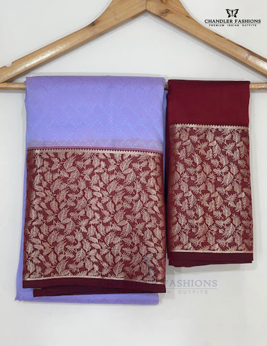Beautiful Lavender Color Pure Kanchi Silk Leaf Motifs With Maroon Color Border And Silver Zari Work Saree For Women - SILKMARK CERTIFIED
