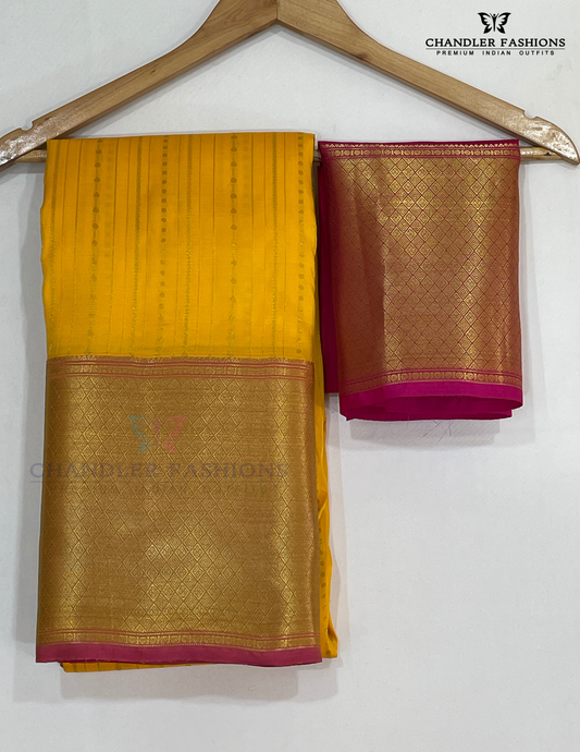 Attractive Yellow Color Pure Kanchi Silk With Bottle Pink Color paisley Motifs Border And Gold Zari Work Saree For Women