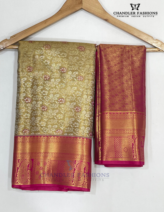 Alluring Gold Color Pure Kanchi Silk With Floral Motifs And Magenta Color With Paisely Motifs Pallu Design Gold Zari Work Saree For Women