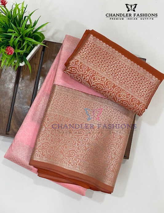 Pretty Light Pink Color Pure Kanchi Silk Floral Motifs With Orange Border And Silver Zari Work Saree For Women - SILKMARK CERTIFIED