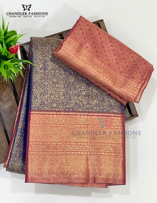 Stunning Copper Color Pure Kanchi Silk With Floral Motifs And Red Color With Paisely Motifs Pallu Design Gold Zari Work Saree For Women