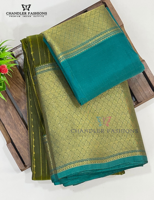 Gorgeous Olive Green Color Pure Kanchi Silk With Rama Green Pallu And Gold Zari With Tradition Motifs Border Work Saree For Women - SILKMARK CERTIFIED