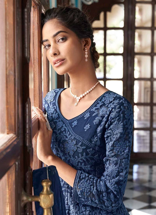 Amazing Navy Blue Colored Faux Georgette With Embroidery Work Indo Western Gowns For Women