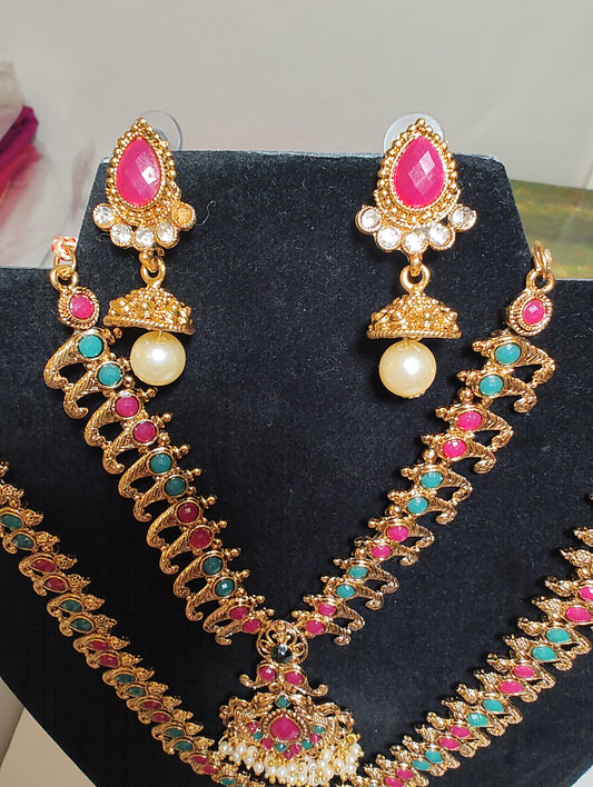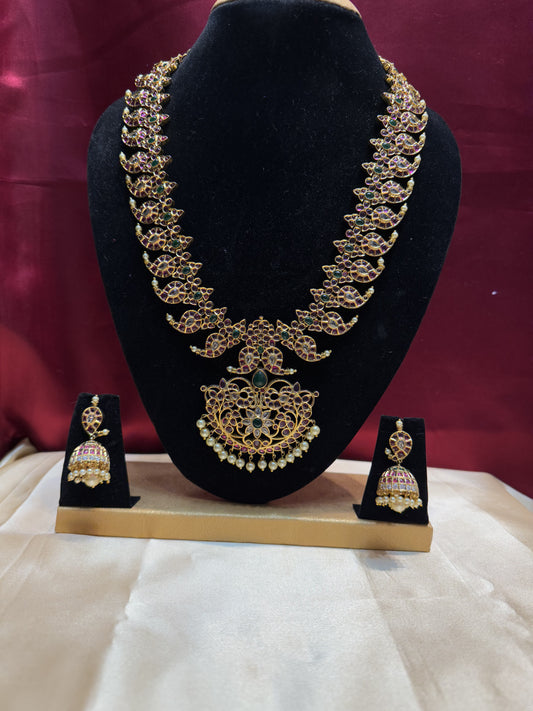 Alluring Long Gold Mango Motif Design Necklace Set With Multicolor StonesRegular price $239.99 USDRegular priceUnit price per$342.99 USDSale price $239.99 USDSale