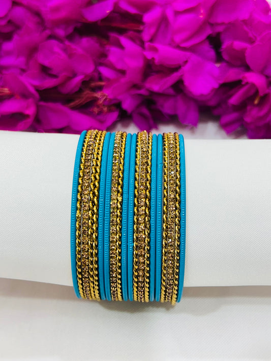 Attractive Sky Blue Color Metal Bangles With Gold Spiral Design For Women
