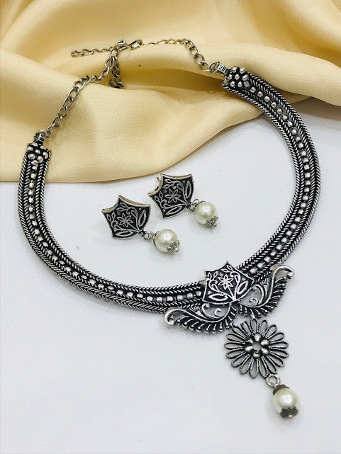 Alluring Gray Color Floral And Peacock Design Oxidized Necklace With Earrings Sets