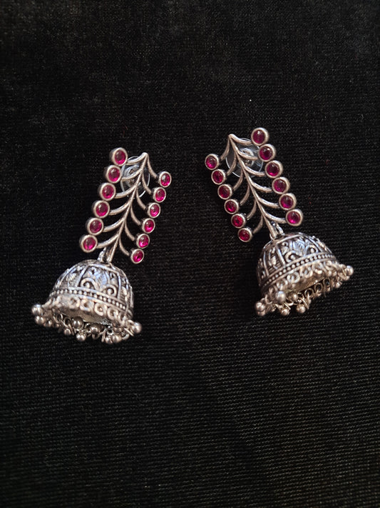Alluring Red Color Floral Design Silver Oxidized Jhumka For Women