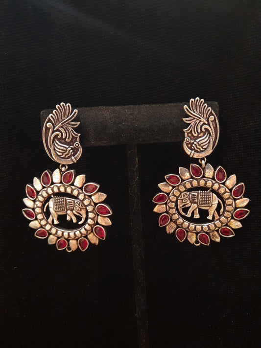 Attractive Red And Silver Oxidized Round Earrings For Women