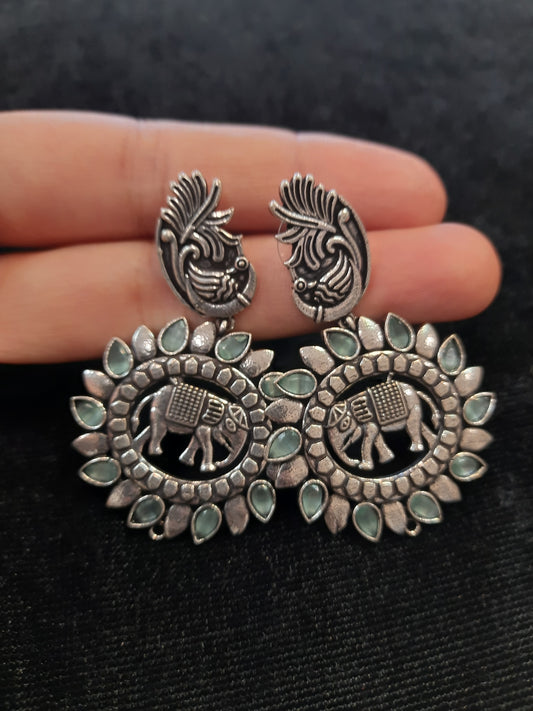 Attractive Green And Silver Oxidized Round Earrings For Women