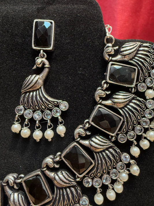 Fabulous Oxidized Black Color Peacock Designed Necklace With Earring Set