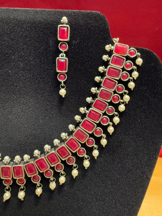 Marvellous Dark Pink Color Oxidized Long Necklace With Earrings Set