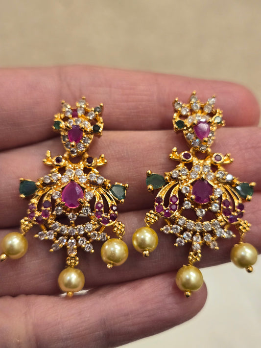 Beautiful Ruby And Emerald AD Stone Earrings With Pearl Dropping