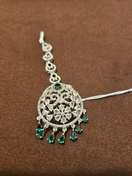 Dazzling Party Wear AD Green Color Stone Maang Tikka For Women