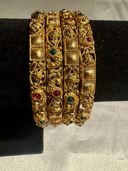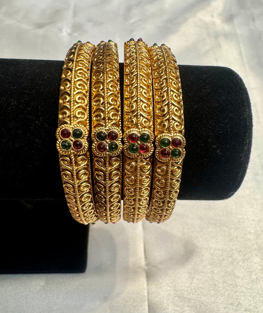 Attractive Red And Green Stones Studded Antique Gold Bangles For Women