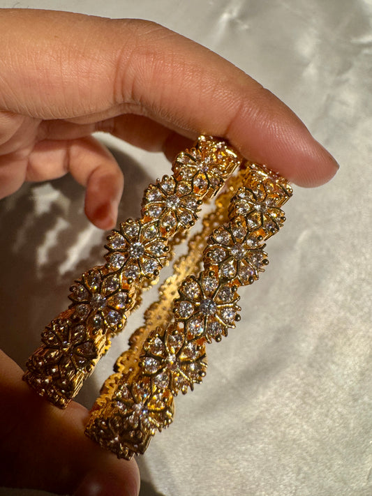 Elegant Gold Plated With Flower Design White Stones Embedded Bangles