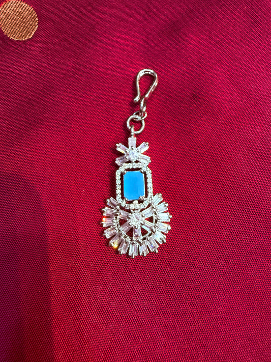 Attractive Designer Sky Blue Color AD Stone Maang Tikka For Women