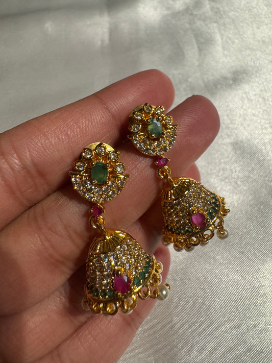 Stunning Multicolor Stones Studded Gold Plated With Pearls Beaded Jhumkas