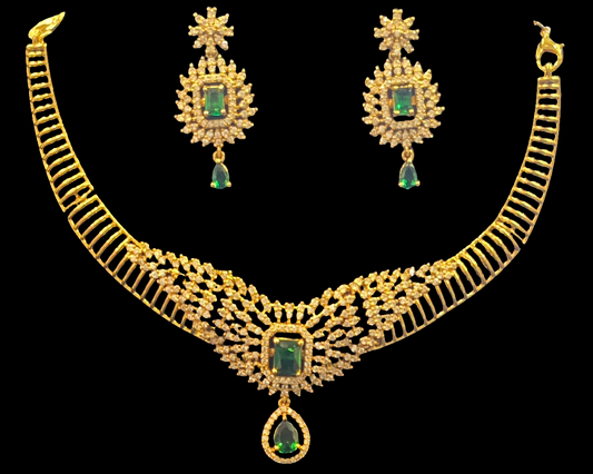 Attractive Green Color Emerald Stones Gold Plated Necklace With Earrings Set