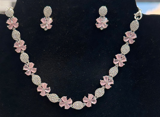 Gorgeous Premium Quality American Diamond Pink And White Stones Necklace With Earrings Set For Women