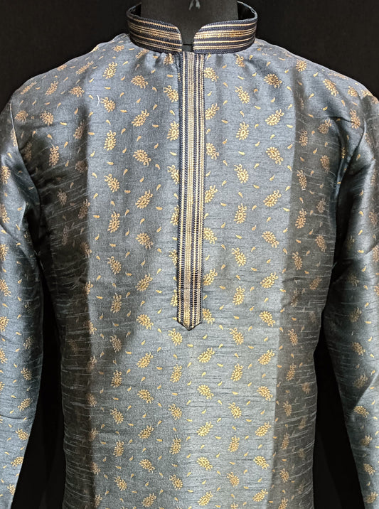 Appealing Gray Colored Banarasi Brocade Silver Zari Work Kurta Pajama Sets For Men