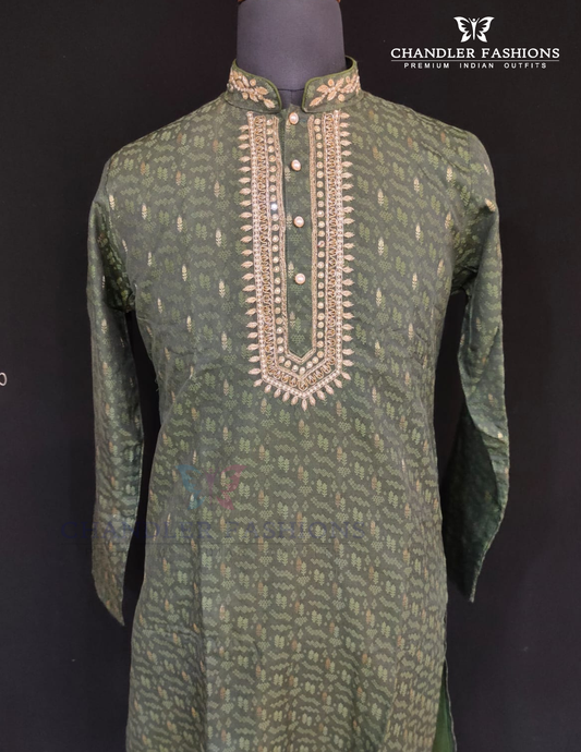 Elegant Mehendi Green Color Brocade With Embroidery Work Kurta Suits For Men