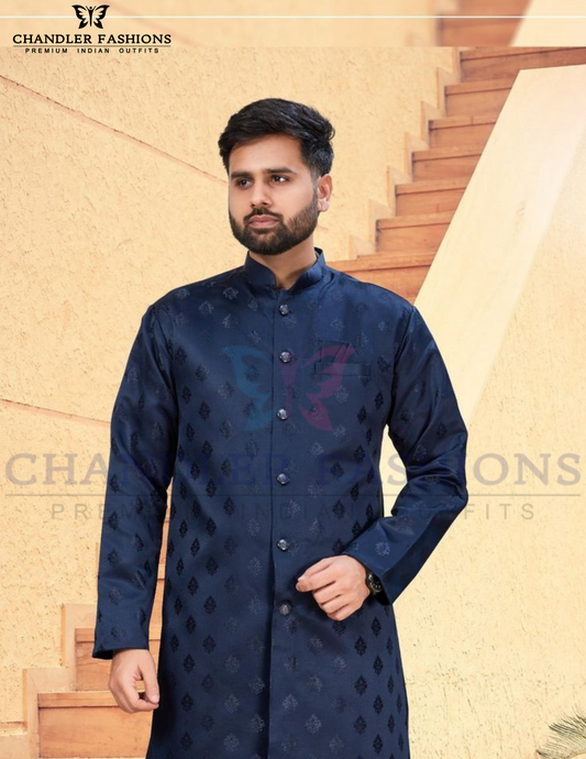 Attractive Dark Blue Color Satin Silk Kurta With Pajama For Men