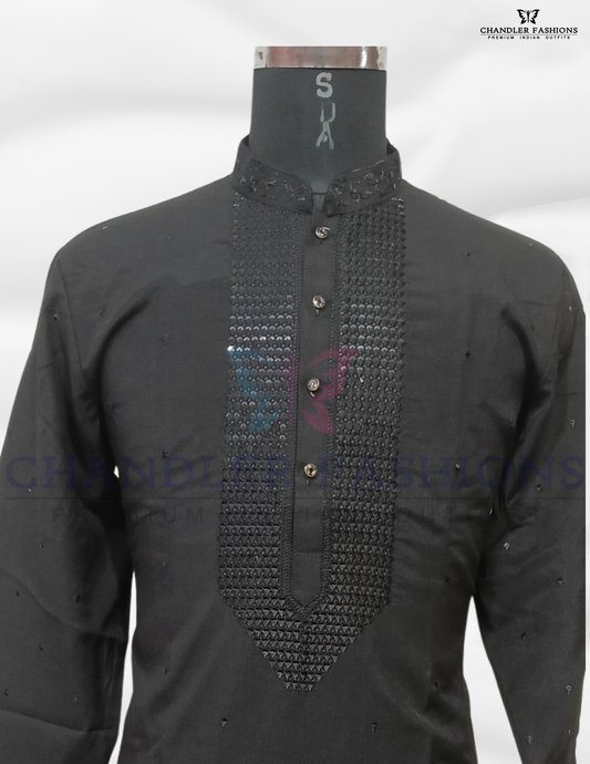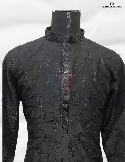 Attractive Black Color Silk Embroidery Kurta With Pajama Suits For Men