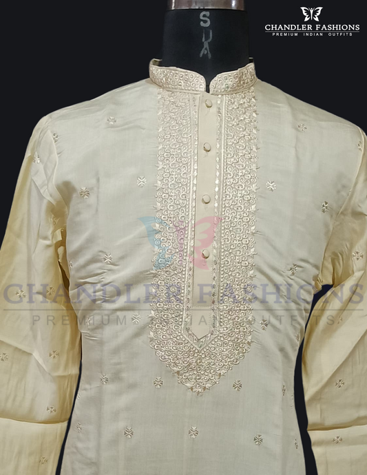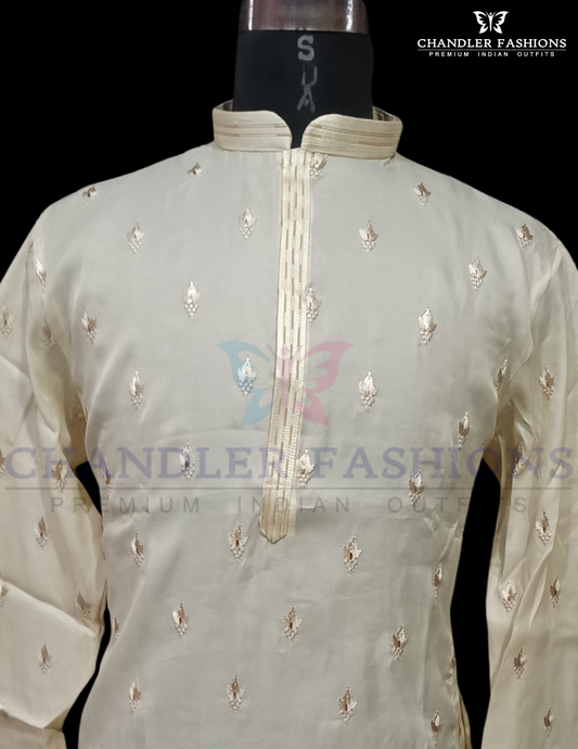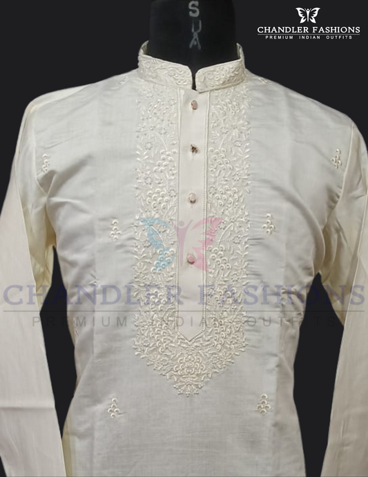 Stunning Ivory Color Silk Embroidery Work Kurta With Pajama For Men