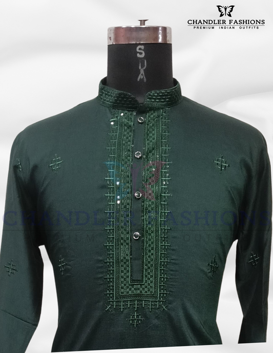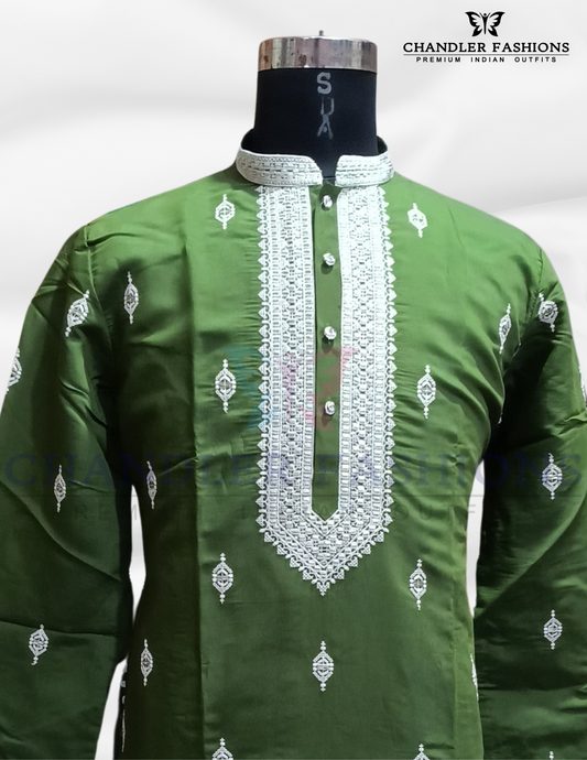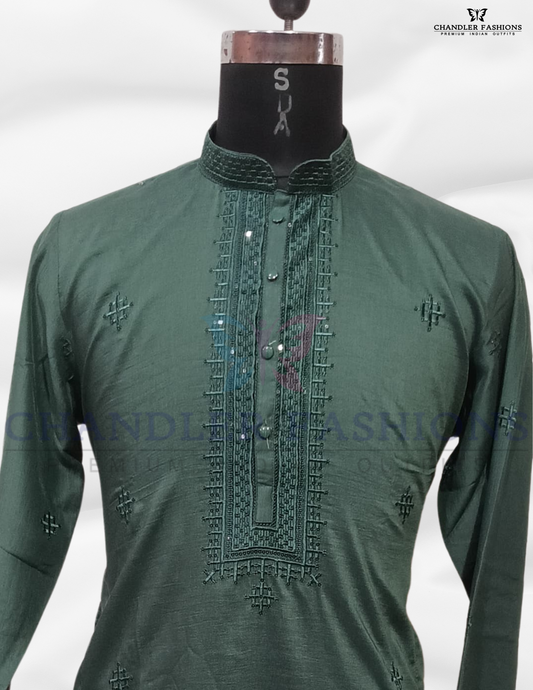 Alluring Green Color Embroidery Thread Work Kurta With Pajama Set For Men