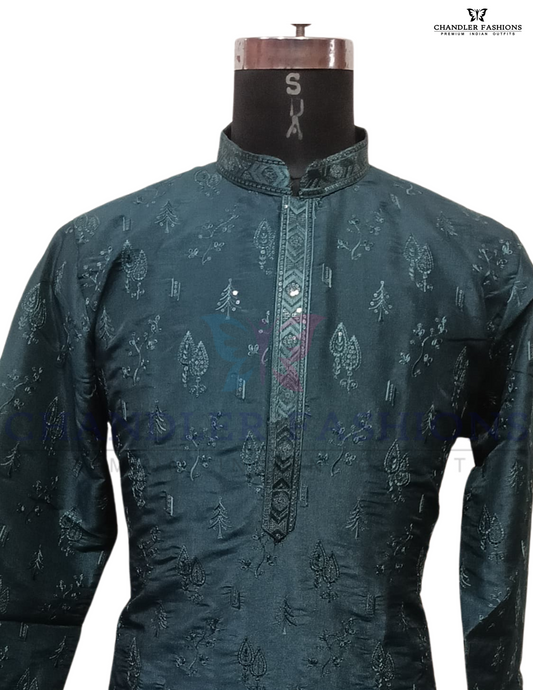 Attractive Teal Blue Color Embroidery Work Kurta With Pajama For Men