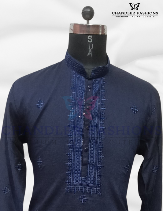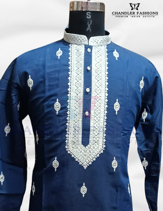Pretty Navy Blue Color Silk Kurta With Embroidery Work And Cotton Pajama Set For Men