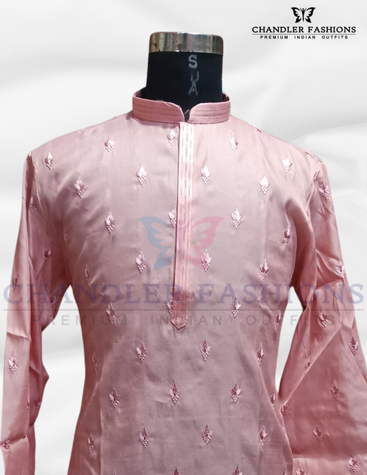 Attractive Pink Color Embroidery Work Silk Kurta With Pajama For Men