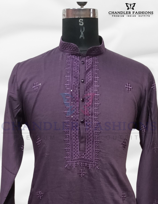 Attractive Purple Color Embroidery Thread Work Kurta With Cotton Pajama Set For Men