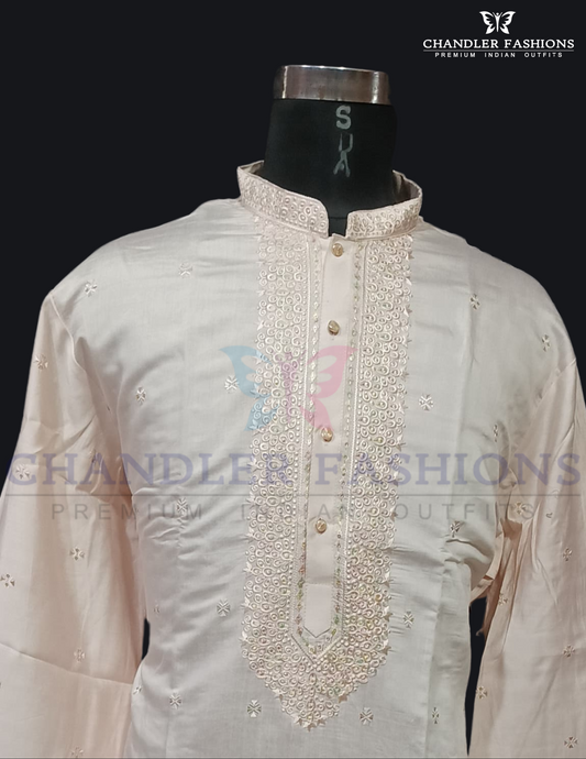 Beautiful Ivory Color Linning Work With Silk Kurta With Pajama For Men
