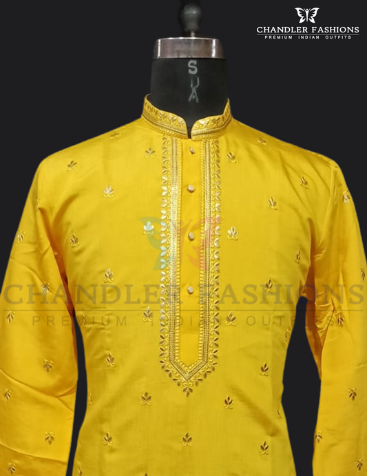 Charming Yellow Color Embroidery Kurta With Pajama Pants For Men