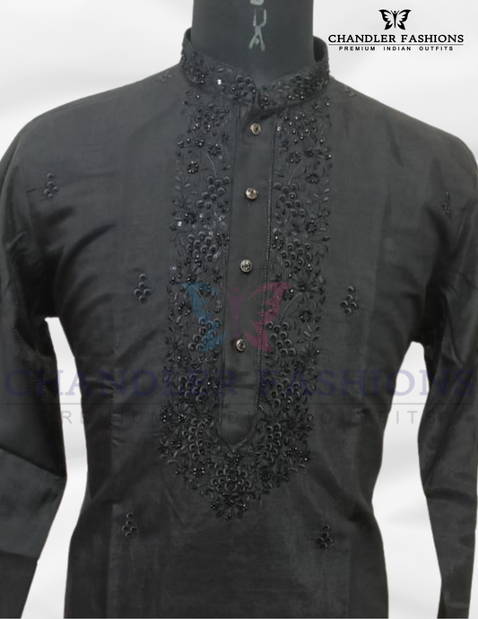 Elegant Black Color Silk Cotton Kurta With Pajama For Men