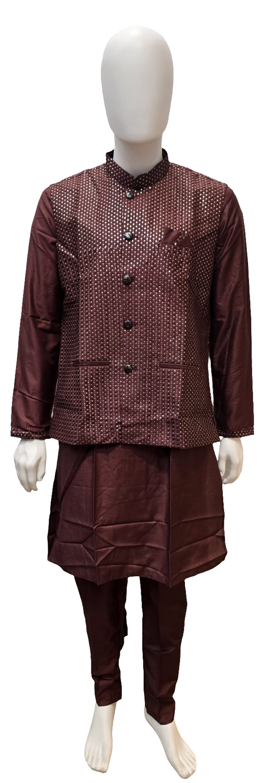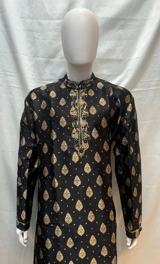 Attractive Black Color Handcrafted Zardozi Work With Small Paisley Designed Men's Brocade Kurta Suits