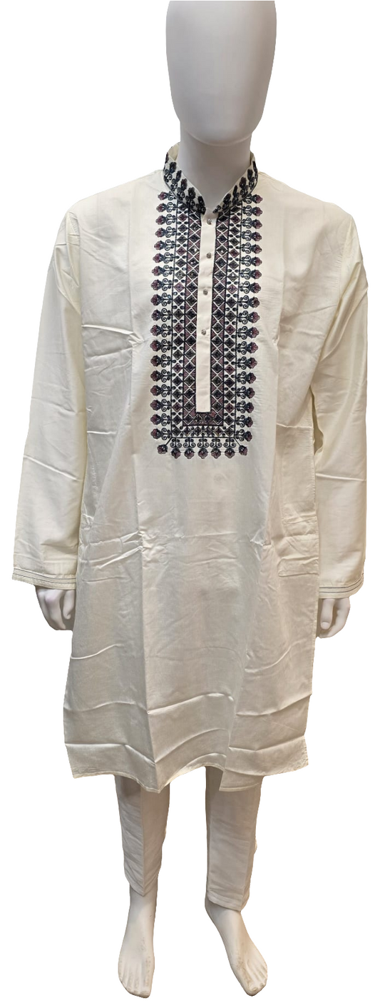 Fabulous Off White Color Soft Silk Cotton With Neck Work Kurta Pajama Pant For Men