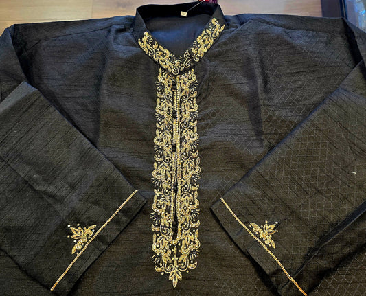 Wonderful Black Color Pure Zardozi Embroidered handwork Mandarin Collar Brocade Kurta With Pajama