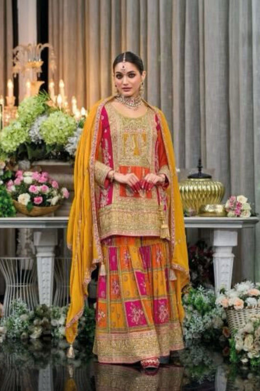 Elegant Yellow Color Heavy Chinon With Embroidery Work Sharara Suits With Dupatta