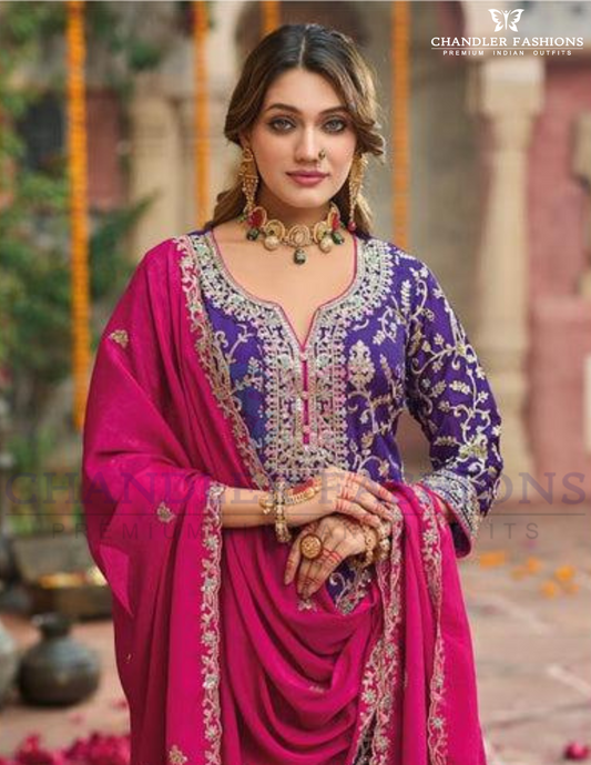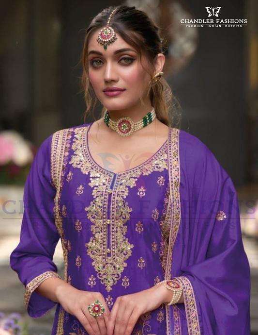 Pretty Violet Color Chinon With Embroidery Work With Palazzo Suits For Women