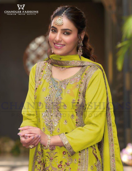 Alluring Lime Green Color Chinon With Embroidery Work With Palazzo Suits For Women