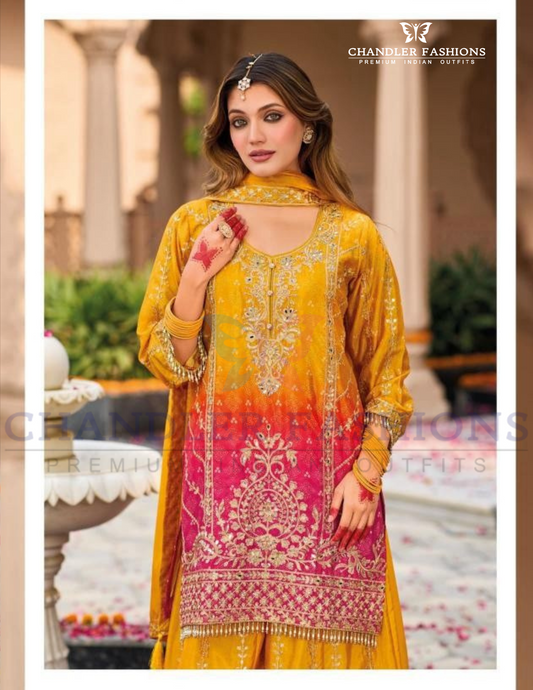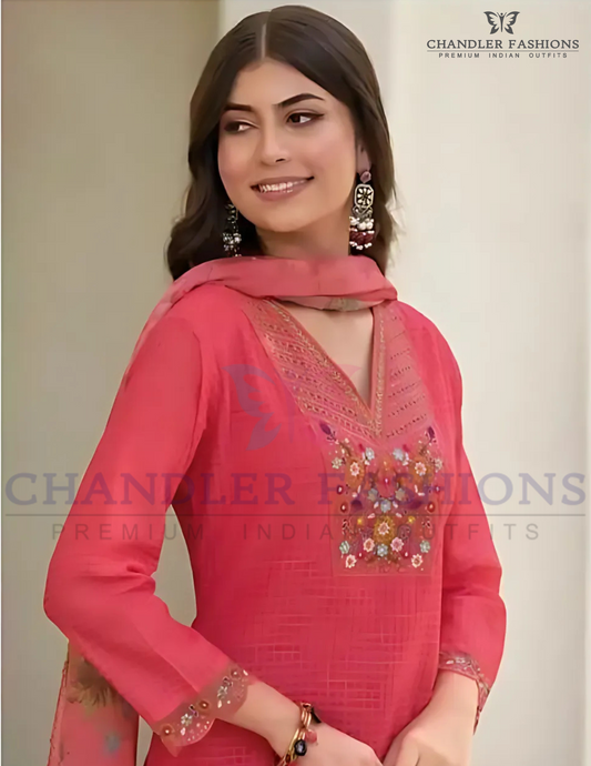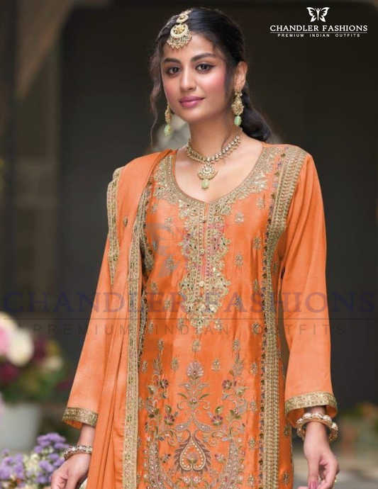 Pretty Orange And Pink Color Chinon With Embroidery Work Palazzo Suits For Women